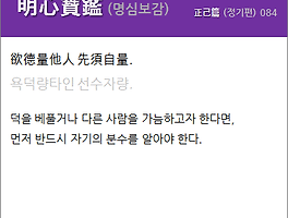| 明心寶鑑(명심보감) 正己篇(정기편) 084. 欲德量他人(욕덕량타인) 先須自量(선수자량). (0) | 2018.06.26 |